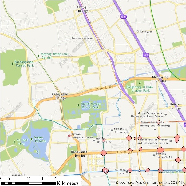 不同时间段的出租车轨迹点具有不同的分布和数据量,我们对每天2点和12点后5分钟内的出租车轨迹点进行聚类的结果,体现出了软件对于不同数据分布和不同数据量的空间聚类结果的稳定性和可靠性。我们选取了北京海淀部分区域和北京全局进行可视化。可以看出,由于不同的数据分布,识别出的区域并不相同,且密度大的地方区域较小,密度小的地方区域较大。类别的高密度中心也能够很好地被识别出来。而k-means和DBSCAN并不具备这些优势。